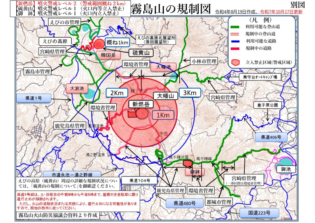 令和7年10月17日 新燃岳の噴火警戒レベルがレベル3(入山規制)からレベル2(火口周辺規制)に引下げられました。