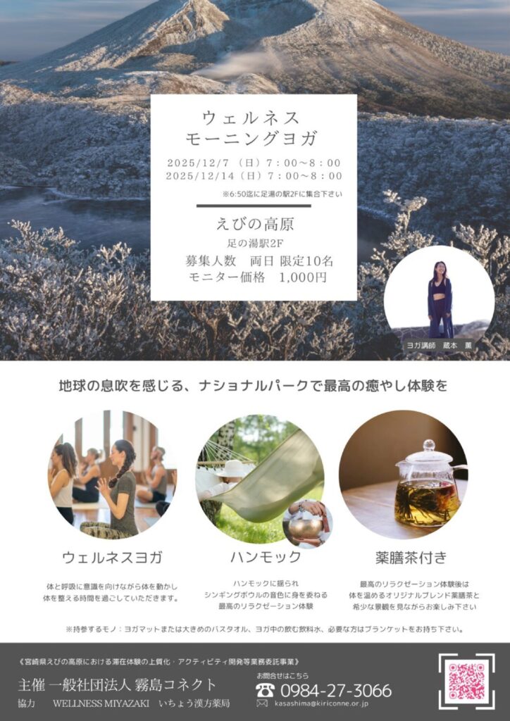霧島コネクトさんが主催するウェルネス モーニングヨガが12月7日(日)・12月14日(日)に開催されます。
