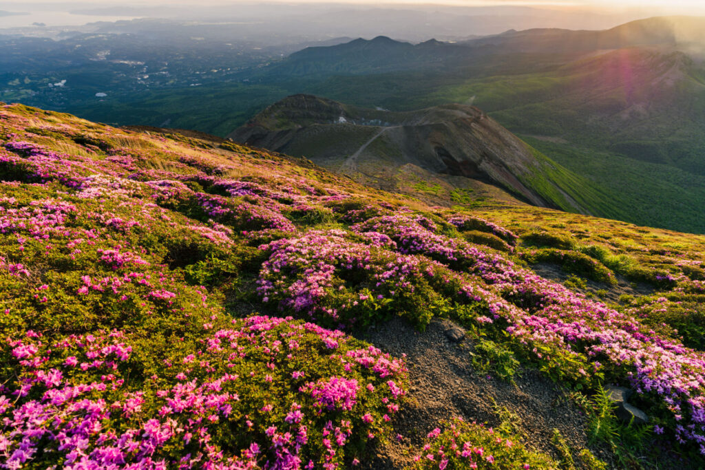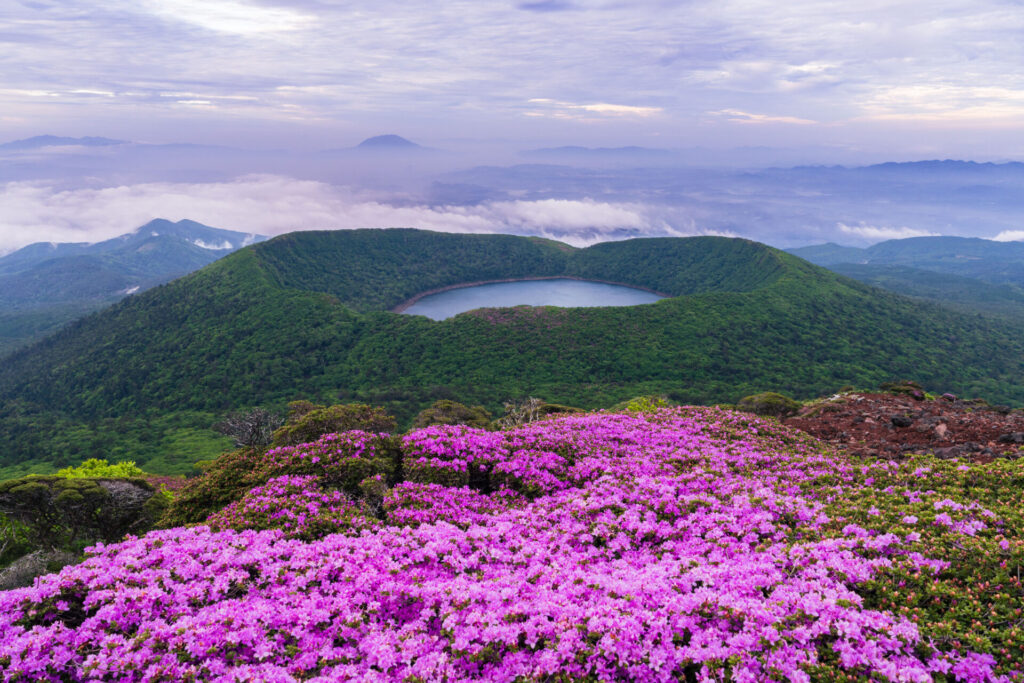 ミヤマキリシマ越しに臨む、霧島連山の山並みが見事です。高千穂峰よりは登りやすい山ですが、しっかりと登山の備えをされて登ってください。